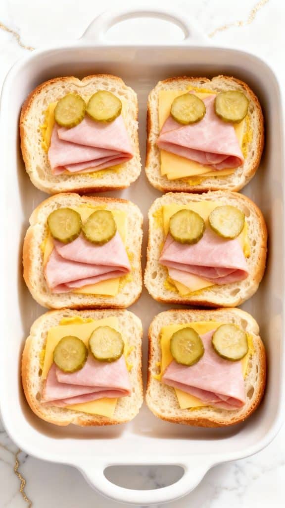 Layer 12 slices of deli ham (folded), then add 6 halved slices of Swiss cheese, and top with 12 dill pickle slices spaced evenly.