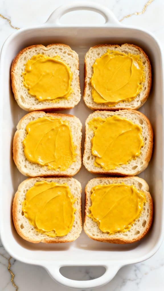 Slice the entire pack of Hawaiian rolls in half horizontally and place the bottom half in a parchment-lined 9×13 baking dish. Spread 2 tablespoons of yellow mustard evenly on the cut side.