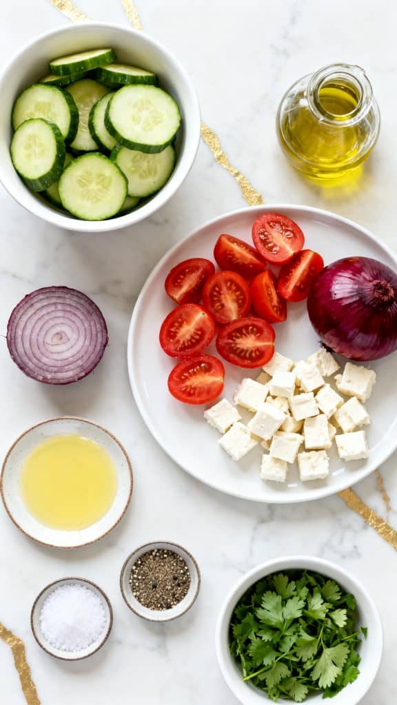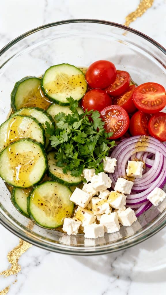 The lemon juice adds acid that brightens the vegetables and balances the saltiness of the feta. Olive oil helps carry flavor across every bite, while the water in cucumbers keeps the salad refreshing and light.