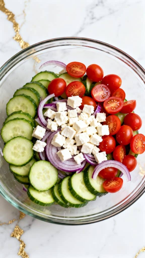 Place sliced cucumbers, halved tomatoes, thin sliced red onion, and ½ cup small diced feta cheese cubes into a large bowl.
