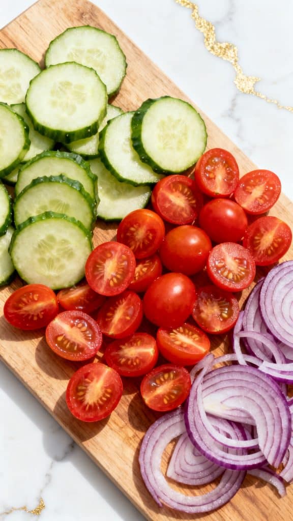 Slice 2 cucumbers into thin rounds, halve 1 ½ cups cherry tomatoes, and thinly slice ½ red onion.