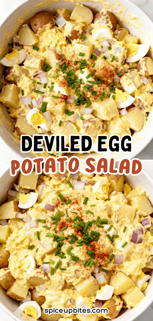 This Deviled Egg Potato Salad is creamy, tangy, and packed with flavor. It takes everything people love about deviled eggs and mixes it into a hearty potato salad. The dressing is rich and smooth, the potatoes are tender, and the eggs add that classic deviled flavor. It’s simple, comforting, and perfect for cookouts, holidays, or a quick make-ahead side.