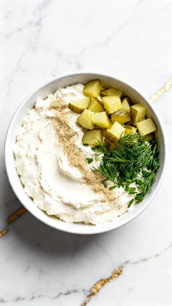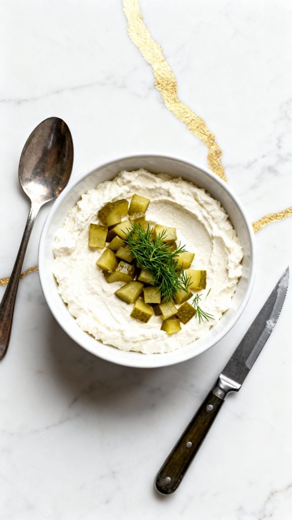Spoon the finished dip into a round bowl and top with a few extra pickles and a little dill.