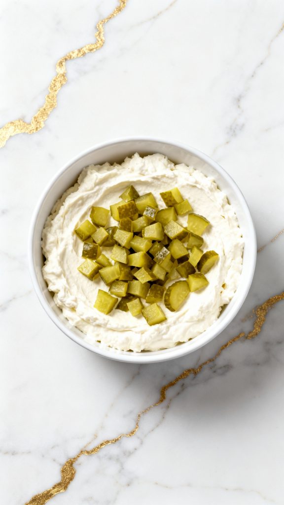 Add ½ cup finely chopped dill pickles to the blended cottage cheese.