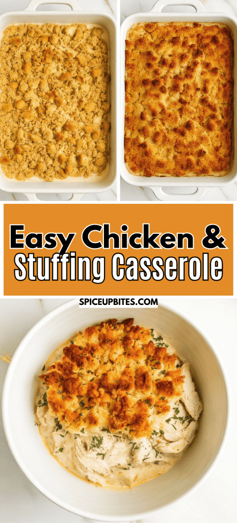Spread the creamy chicken mixture evenly in a greased 8×8 or 9×9 baking dish. Spoon the stuffing over the top and gently spread it out without pressing down too hard.