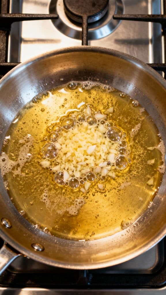 In the same pot or a large skillet, melt 4 tablespoons unsalted butter over medium heat. Add 5 cloves finely minced garlic and cook for about 1–2 minutes, stirring, until it’s golden and smells amazing.