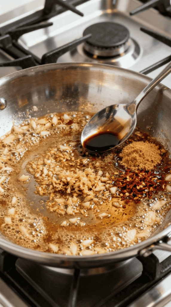 Stir in 1 tablespoon low-sodium soy sauce, 1 teaspoon brown sugar, and ½ teaspoon chili flakes (optional). Let it bubble for 30 seconds to blend flavors.