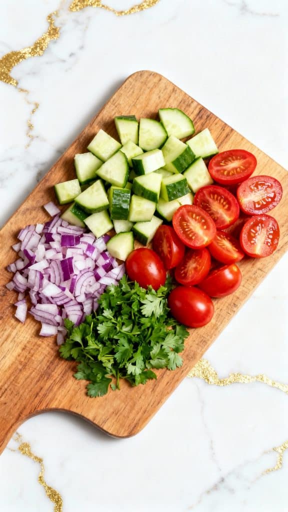 Dice ½ cup cucumber, halve ½ cup cherry tomatoes, and finely chop ¼ cup red onion. Chop 2 tablespoons of fresh parsley.