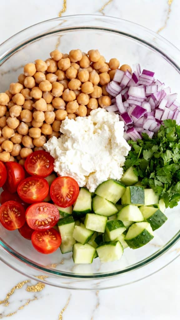 In a large bowl, add the chickpeas, 1 cup cottage cheese, diced cucumber, halved cherry tomatoes, chopped red onion, and chopped parsley.
