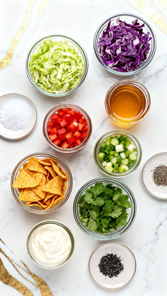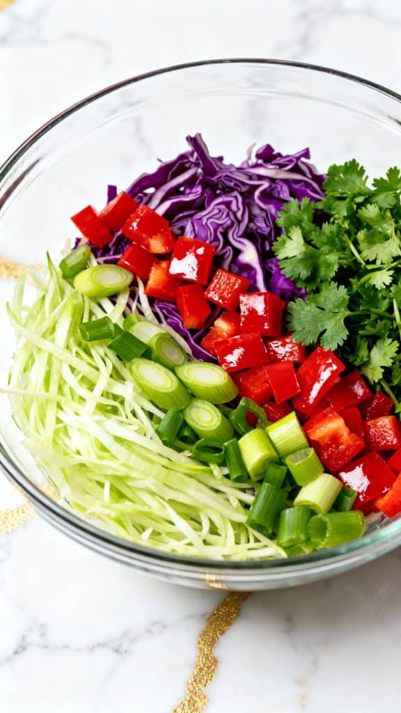 Shred 4 cups green cabbage and 2 cups purple cabbage. Dice 1 red bell pepper and slice 3 green onions. Chop 1/2 cup fresh cilantro.