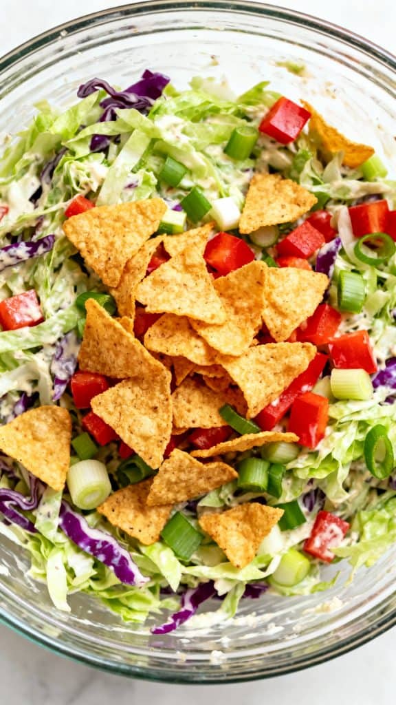 Right before serving, sprinkle 1 cup Fritos corn chips over the salad and gently toss.