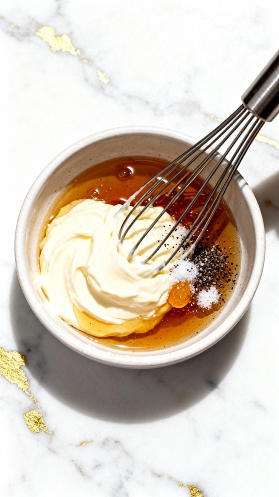 In a small bowl, whisk together 1/2 cup mayonnaise, 2 tablespoons apple cider vinegar, 1 tablespoon honey, 1/2 teaspoon salt, and 1/4 teaspoon black pepper until smooth.