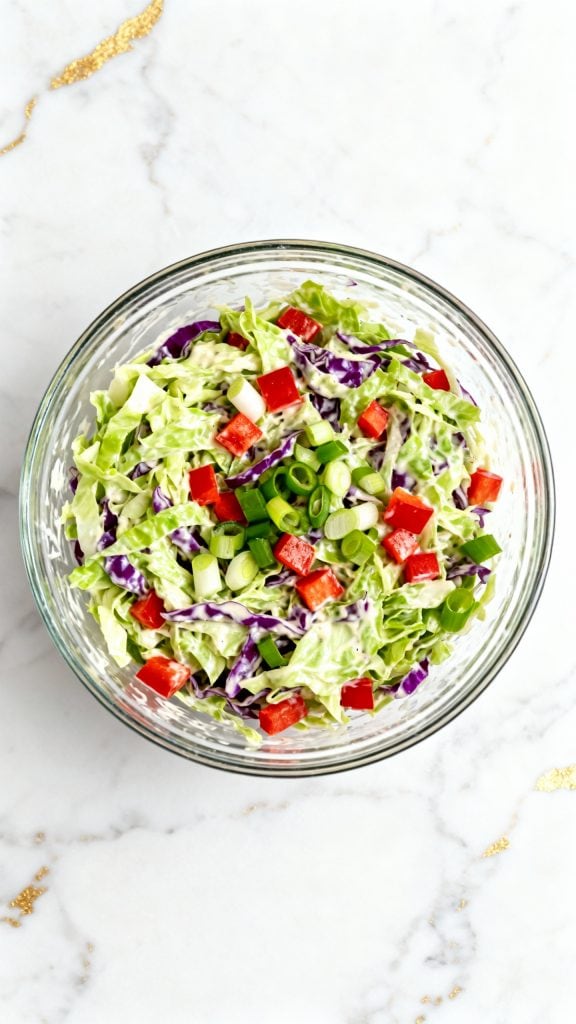 In a large mixing bowl, toss shredded green cabbage, shredded purple cabbage, diced red bell pepper, sliced green onions, and chopped cilantro with the prepared dressing.