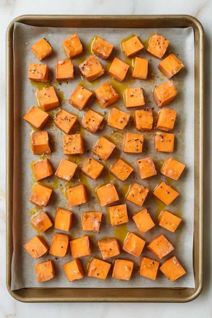 Spread the coated sweet potatoes in a single layer on a baking sheet lined with parchment paper.