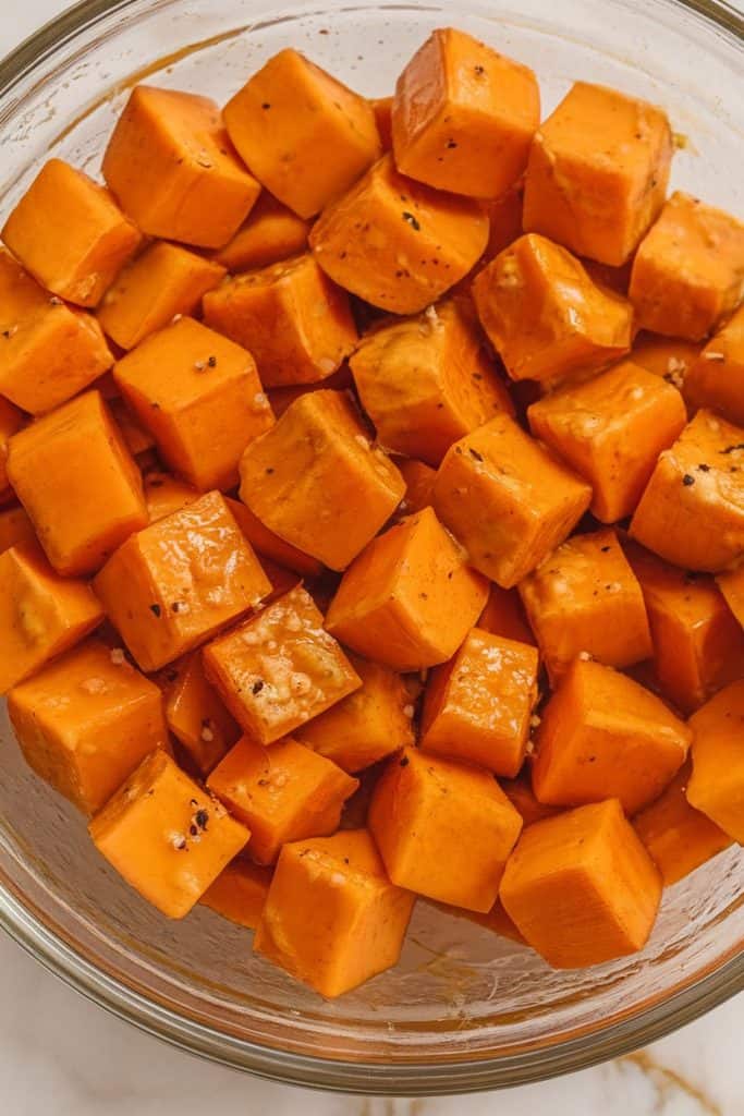 In a large bowl, toss 3 large sweet potatoes (peeled and cubed) with the garlic butter, 1 tablespoon olive oil, 1 teaspoon salt, and ½ teaspoon black pepper until everything is coated evenly.