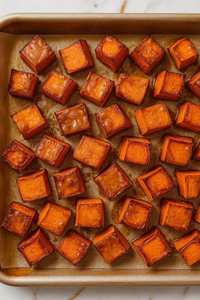 Roast at 400°F for 25–30 minutes, flipping halfway through, until sweet potatoes are golden and edges are crispy.