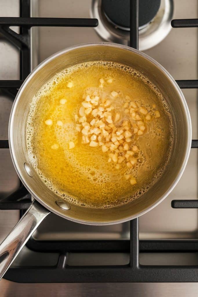 In a small saucepan, melt 3 tablespoons unsalted butter over low heat. Add 3 cloves minced garlic and cook for 30 seconds, just until fragrant.