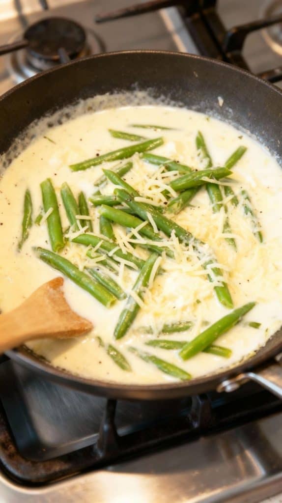 Stir in the blanched green beans and ½ cup shredded mozzarella cheese until everything is coated in sauce.