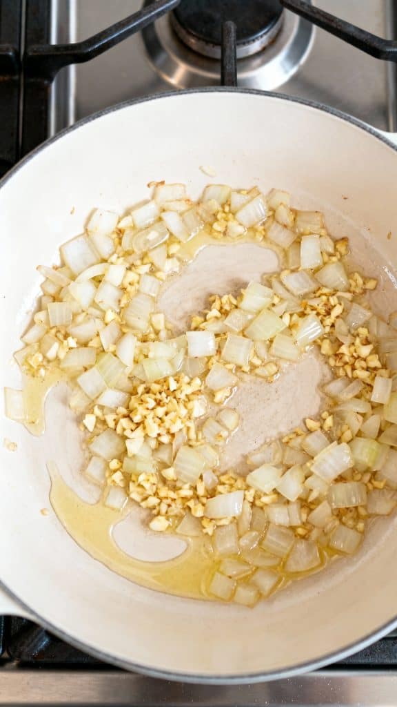 In a large pot, heat 1 tablespoon olive oil over medium heat. Add ½ diced onion and 2 cloves minced garlic. Cook until softened, about 2–3 minutes.