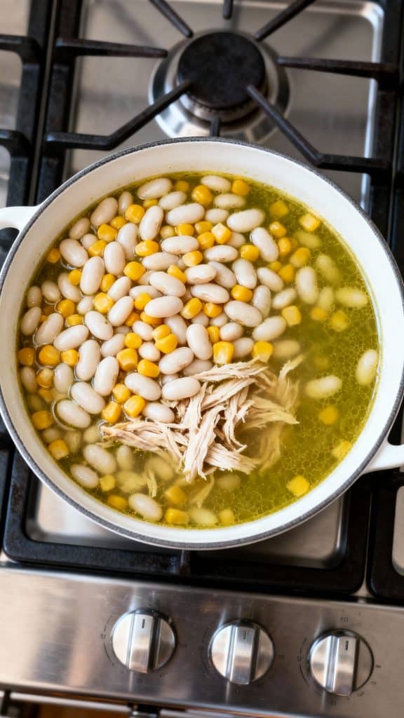 Add 1 (15 oz) can white beans (drained and rinsed) and 1 cup frozen corn. Stir and let it simmer for 5 minutes.