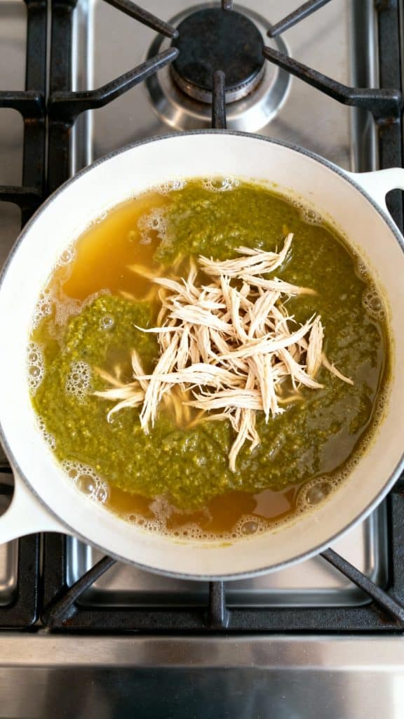 Pour in 1 (10 oz) can green enchilada sauce and 4 cups chicken broth. Stir in 2 cups cooked shredded chicken. Bring to a simmer.