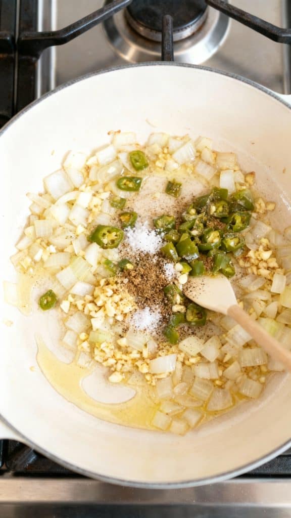 Stir in 1 teaspoon cumin, ½ teaspoon salt, ½ teaspoon black pepper, and 1 (4 oz) can diced green chiles. Cook for another minute.