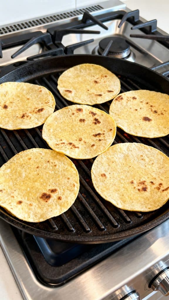 Place 6 corn tortillas on the grill pan and warm for about 30 seconds per side until soft and slightly toasted.