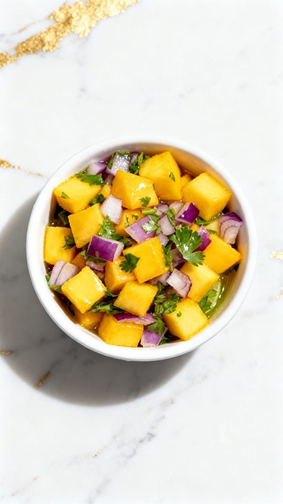 In a small bowl, combine 1 diced mango, 1/4 cup finely diced red onion, 2 tablespoons chopped cilantro, juice of 1/2 lime, and 1/4 teaspoon salt. Stir gently until mixed. Set aside.