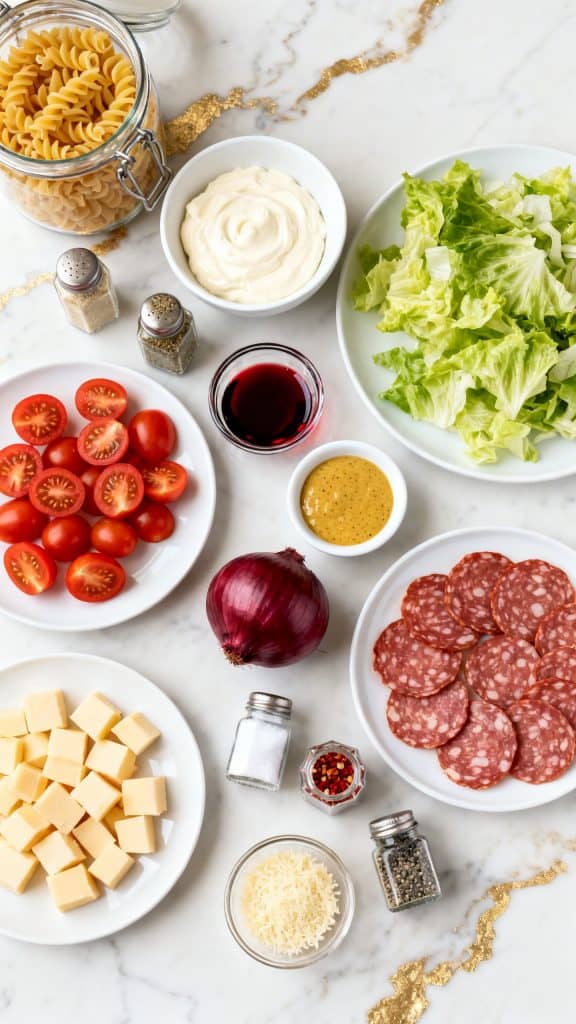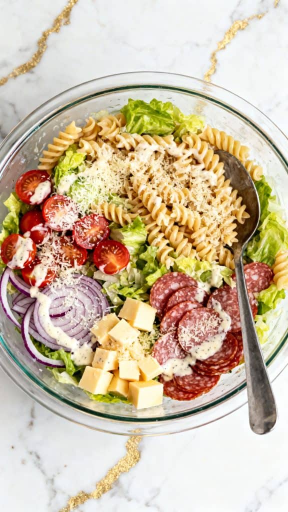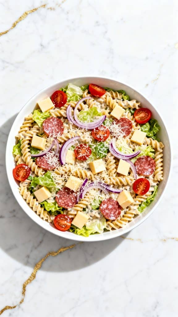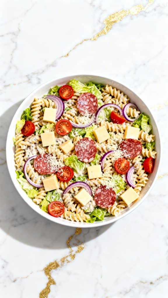 The first time I made this was after craving a grinder sandwich but wanting something easier to share. I tossed everything into pasta instead of bread, and it was even better than I hoped. It’s filling, crunchy, creamy, and a little tangy all at once.
