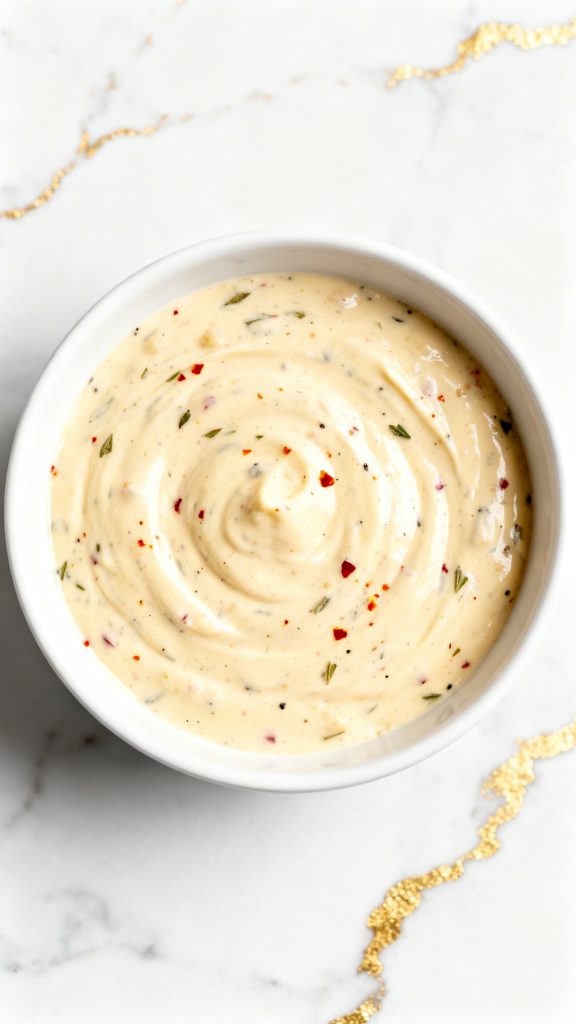 In a medium bowl, whisk together 1 cup mayonnaise, 2 tablespoons red wine vinegar, 1 teaspoon Dijon mustard, 1/2 teaspoon garlic powder, 1/2 teaspoon dried oregano, 1/2 teaspoon salt, 1/2 teaspoon black pepper, and 1/4 teaspoon crushed red pepper flakes until smooth and creamy.