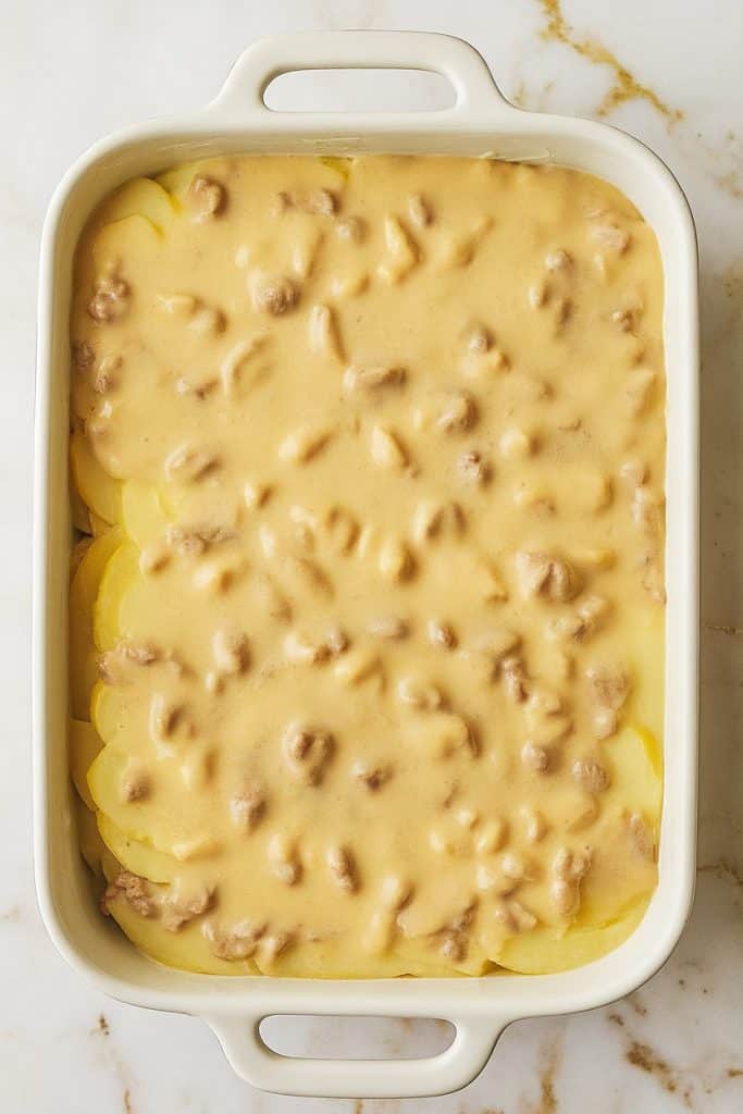 Drizzle half the soup and milk mixture evenly over the beef and potatoes.