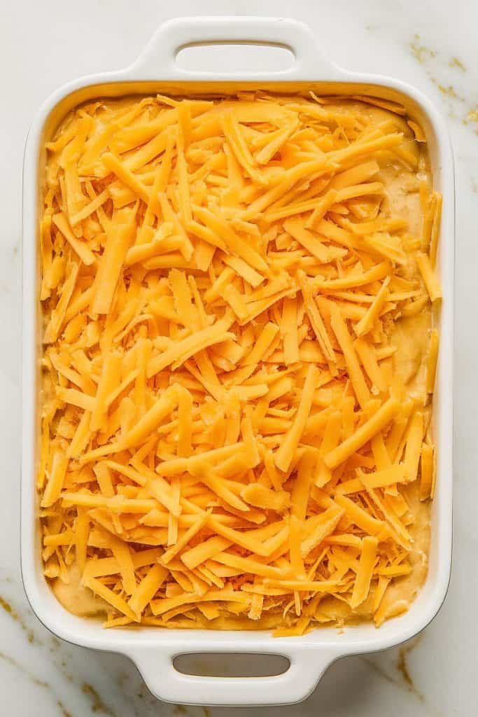 Sprinkle 1 1/2 cups shredded cheddar cheese evenly over the top layer.