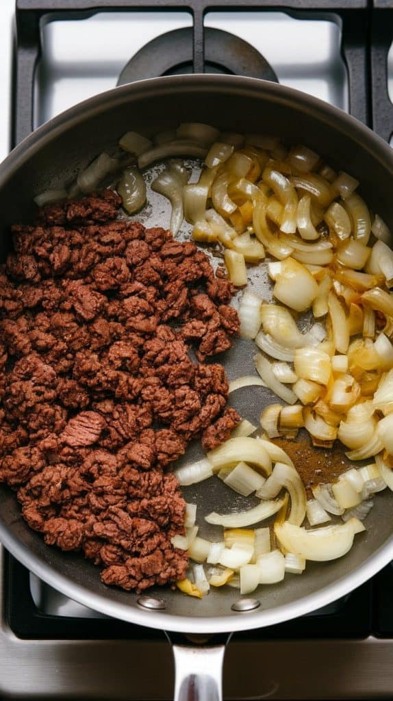 In a skillet over medium heat, cook 1 lb ground beef with 1 small yellow onion (diced) until beef is browned and onion is soft, about 6–8 minutes. Season with 1/2 tsp salt, 1/2 tsp pepper, 1 tsp garlic powder, and 1/2 tsp onion powder. Drain excess grease.