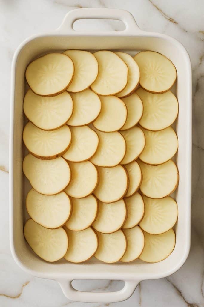 Spray a 9×13 casserole dish with non-stick spray. Lay down a layer of thinly sliced potatoes (1 1/2 of the 3 russet potatoes), slightly overlapping.