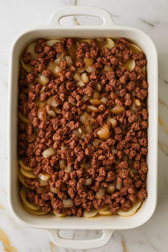 Spoon half the cooked beef and onion mixture evenly over the potatoes.