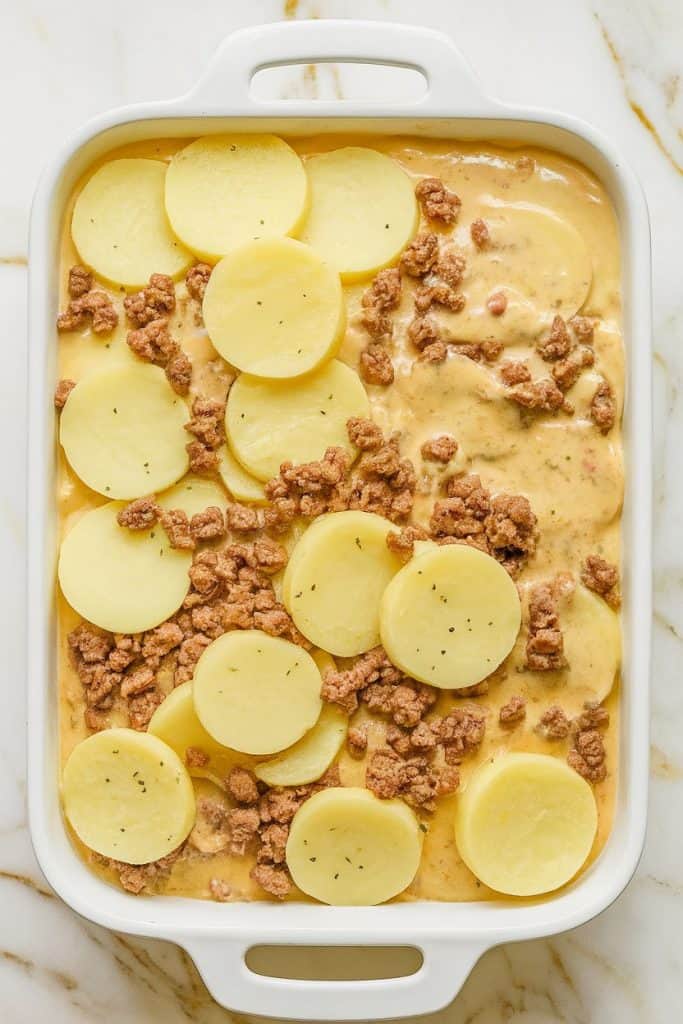 Repeat with remaining potatoes, beef, and creamy sauce.