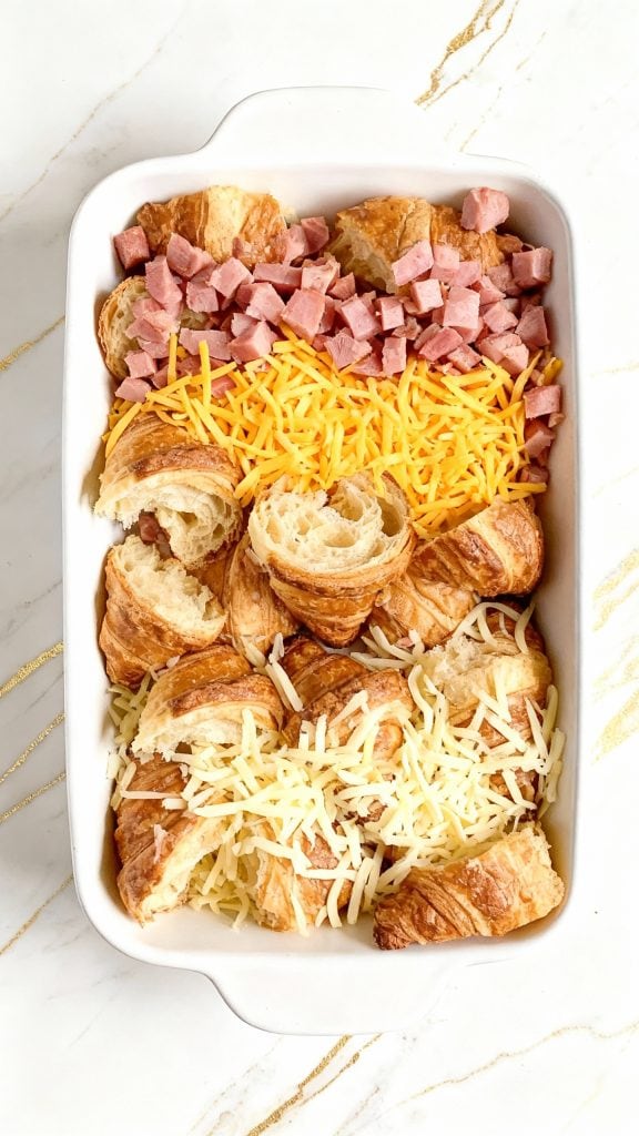 Sprinkle 1½ cups diced cooked ham evenly over the croissants. Then top with 1 cup shredded cheddar and 1 cup shredded mozzarella.