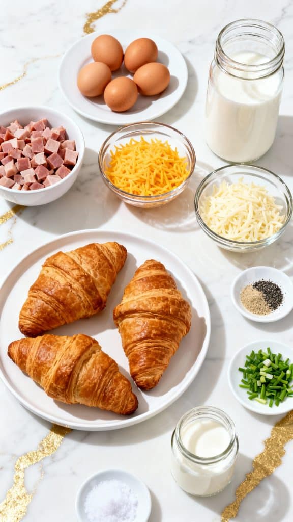 Croissants are rich with butter and air pockets, making them ideal for soaking up a custard without getting soggy. The eggs set into a soft, savory custard while the ham and cheese add protein, fat, and salt—so every bite is balanced. Baking at 350°F allows the top to crisp while the center cooks through gently.