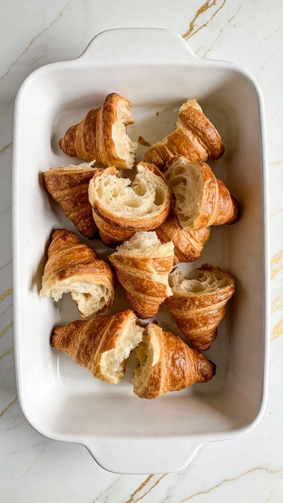 Grease a 9×13 baking dish with butter or nonstick spray. Tear 4 large croissants into big chunks and scatter evenly in the dish.