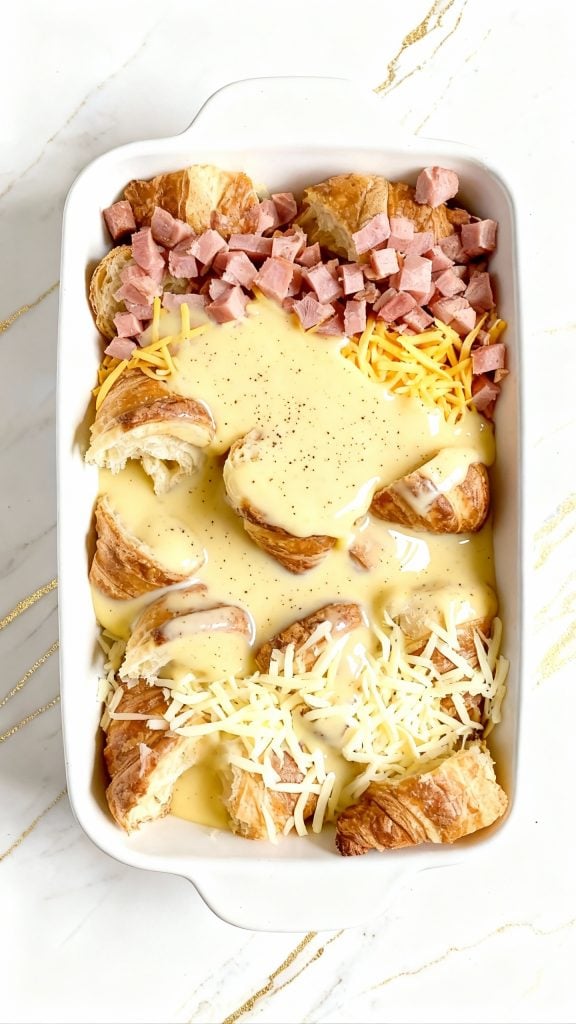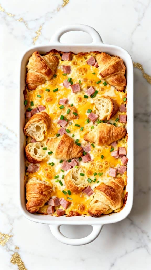 Flaky croissants, smoky ham, melty cheese, and a creamy egg custard all baked together into one bubbly, golden dish. It’s perfect for breakfast, brunch, or even dinner.