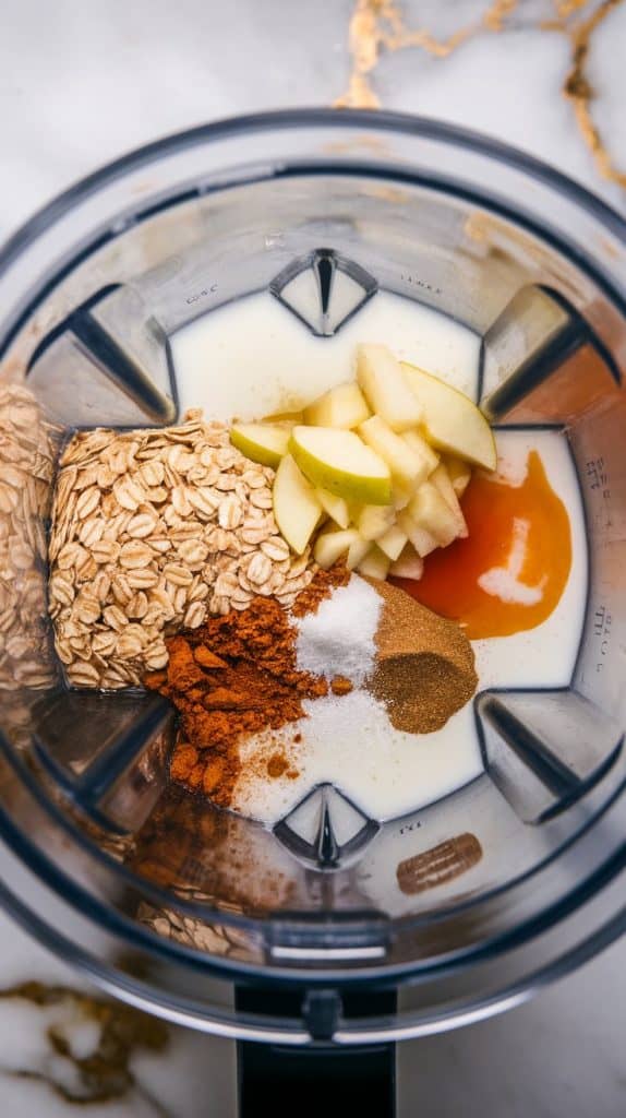Add 1 cup rolled oats, 1/2 grated apple, 1/2 cup milk, 1 egg, 1 tbsp maple syrup, 1/2 tsp cinnamon, 1/2 tsp baking powder, and a pinch of salt to a blender.