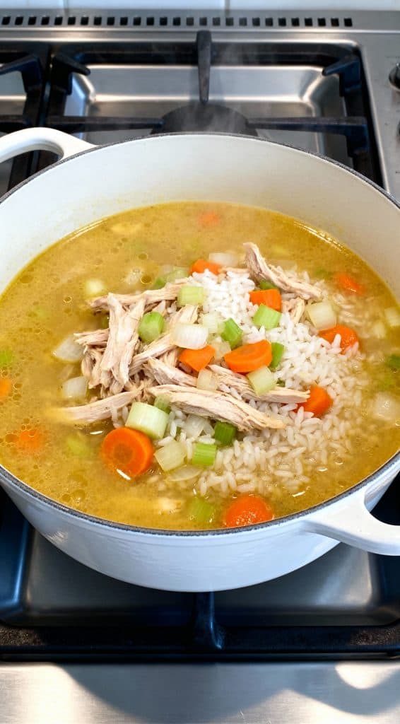 Lower heat to medium-low. Stir in 1 cup cooked shredded chicken and ¾ cup cooked white rice. Let simmer for 10 minutes to blend the flavors.