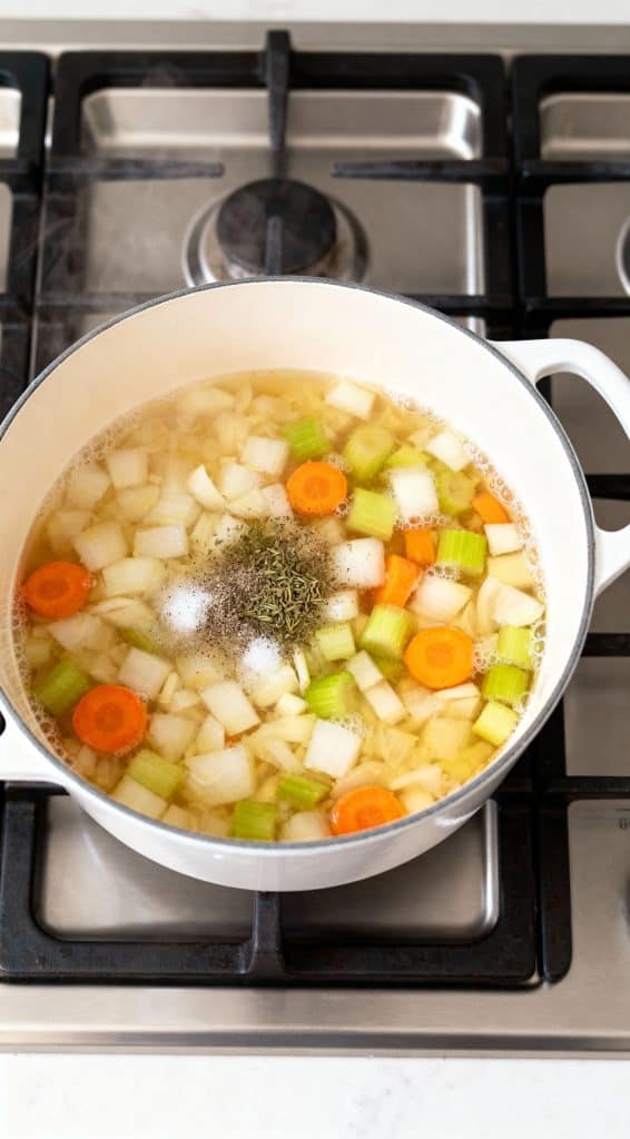 Sprinkle in 1 teaspoon dried oregano, ½ teaspoon salt, and ¼ teaspoon black pepper. Stir well. Pour in 6 cups of low-sodium chicken broth. Bring to a gentle boil.