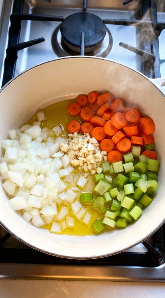 Heat 1 tablespoon olive oil in a large Dutch oven over medium heat. Add 1 diced yellow onion, 2 minced garlic cloves, 2 sliced carrots, and 1 chopped celery stalk. Sauté until soft and fragrant, about 5–6 minutes.