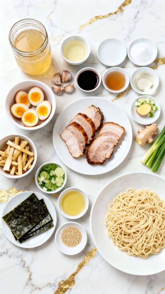 Place cooked noodles in bowls. Ladle hot broth over them. Top with halved eggs, pork slices, bamboo shoots, sliced green onions, and nori sheet.
