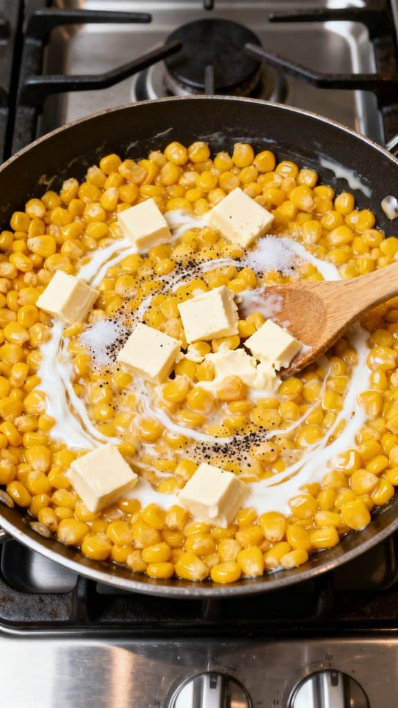 Add 2 ounces cubed cream cheese, 1/4 teaspoon salt, and 1/8 teaspoon black pepper to the hot corn. Stir often for 3 to 4 minutes, breaking up the softened cream cheese as it melts. Keep stirring until the sauce turns creamy and lightly coats all the corn.