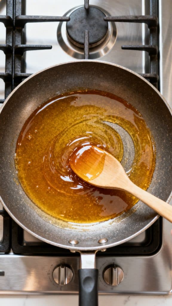Image prompt: Ultra close-up shot of 2 tablespoons unsalted butter melting into 2 tablespoons honey in a large skillet, butter partly melted and honey glossy and pooling together, wooden spoon gently stirring, the skillet straight and centered, the main object fully in frame and not cropped out, a straight 90-degree top-down shot with no tilt, captured directly overhead, on a modern stainless steel gas stove, bright natural light, rich detail, food texture emphasized