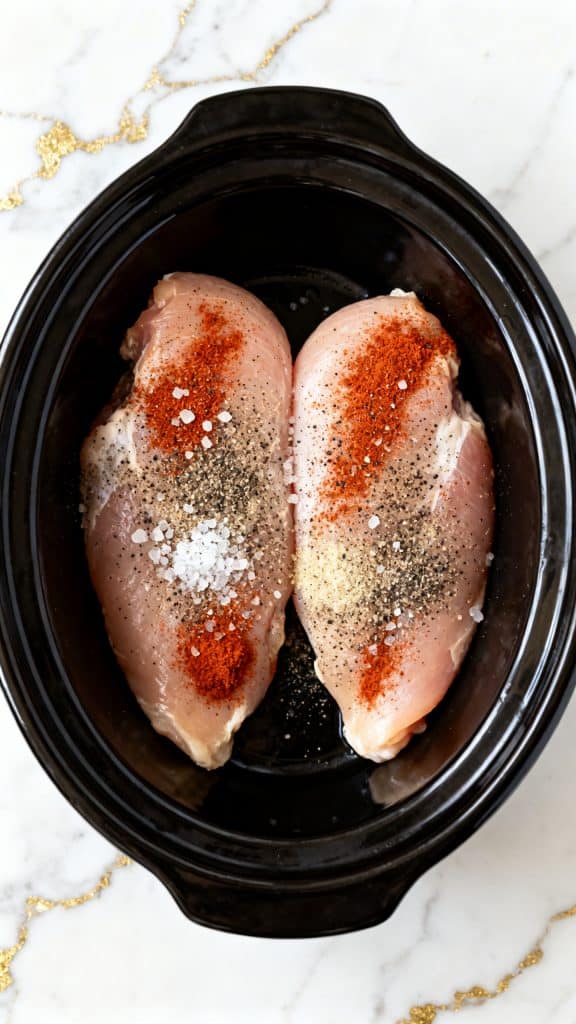 Place 2 pounds raw boneless skinless chicken breasts into the black oval crockpot. Sprinkle 1 teaspoon salt, 1/2 teaspoon black pepper, 1 teaspoon garlic powder, and 1 teaspoon paprika evenly over the top of the chicken breasts.
