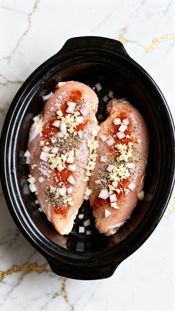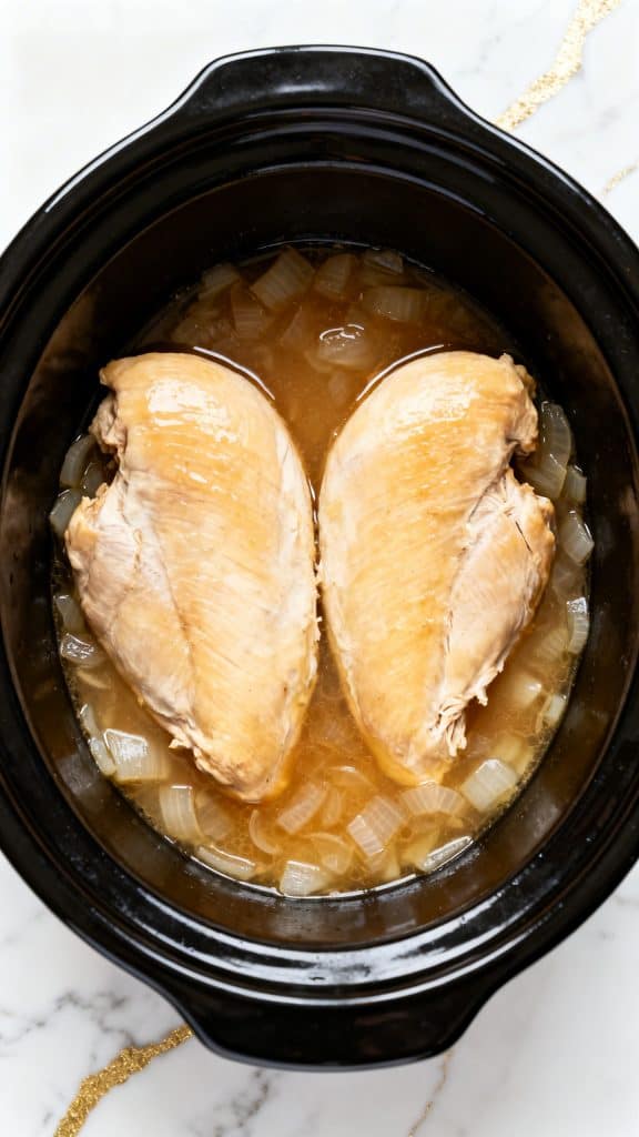 Slow cooking works because it gently breaks down the connective tissue in the chicken over time. The low heat keeps the meat from drying out. The broth adds moisture, and the lid traps steam inside the crockpot. That steam helps the chicken stay juicy while it cooks slowly and evenly.