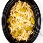 Remove the lid. Use two forks to shred the fully cooked chicken breasts directly inside the crockpot. Mix the shredded chicken with the cooking juices, softened diced onion, and cooked minced garlic.